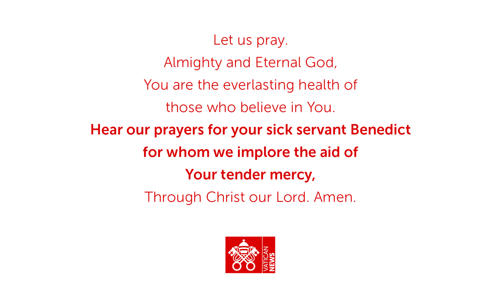 “Saya minta Anda untuk berdoa secara khusus bagi Paus Emeritus Benediktus, yang dalam keheningan terus mendukung Gereja. Ingatlah dia, dia sangat sakit, mohonkanlah kepada Tuhan untuk menguatkan dia dan menghibur dia dalam kesaksiannya mencintai Gereja, hingga akhir”.