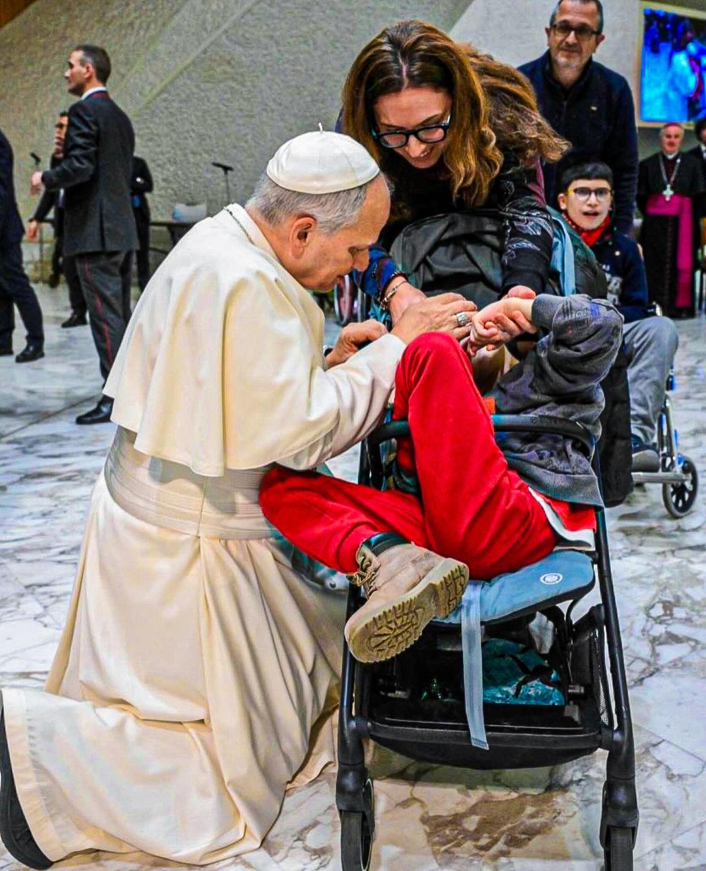 Foto lain yang beredar luas di media sosial hari-hari ini ialah gestur Paus Leo menyambut hangat seorang anak berkebutuhan khusus. Paus berlutut untuk menyalami anak tersebut yang sedang terbaring di atas kursi rodanya, ditemani seorang wanita, yang mungkin ibunya.